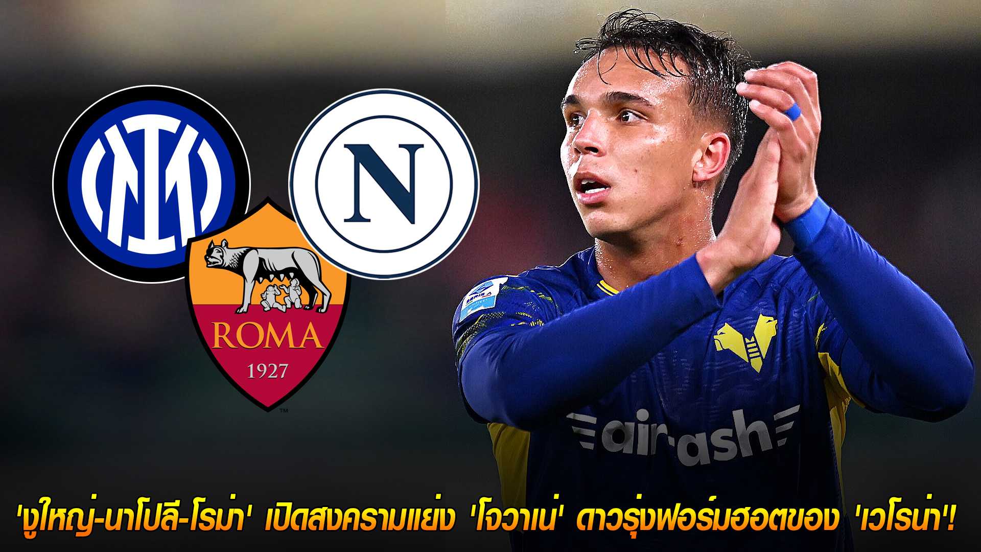 ตลาดซื้อขายนักเตะอิตาลีกำลังระอุ! เมื่อบรรดาทีมยักษ์ใหญ่แห่งเซเรีย อา ทั้ง อินเตอร์ มิลาน, นาโปลี, และ โรม่า (รวมถึงอตาลันต้า) ต่างกำลังเดินหน้าแย่งชิงลายเซ็นของ โจวาเน่ ปีกดาวรุ่งฟอร์มแรงวัย 22 ปี ของ เฮลลาส เวโรน่า ที่กำลังฉายแววโดดเด่นในฤดูกาลแรกบนลีกสูงสุด!